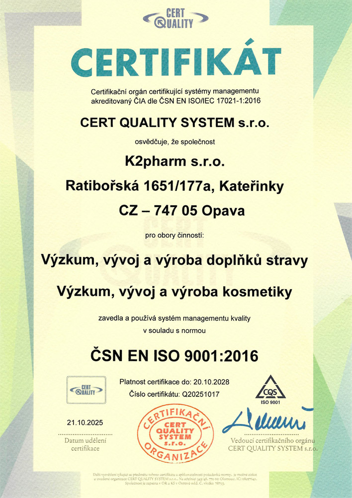 Systém analýzy rizika a stanovení kritických kontrolních bodů (Hazard Analysis and Critical Control Points - HACCP) ve výrobě potravin je jedním ze základních nástrojů, jak účinně předcházet rizikům ohrožujícím bezpečnost potravin, tedy i doplňků stravy. Certifikace systému HACCP je prokazatelným potvrzením funkčnosti a efektivity zavedeného systému HACCP. Naše společnost prochází pravidelnými audity.